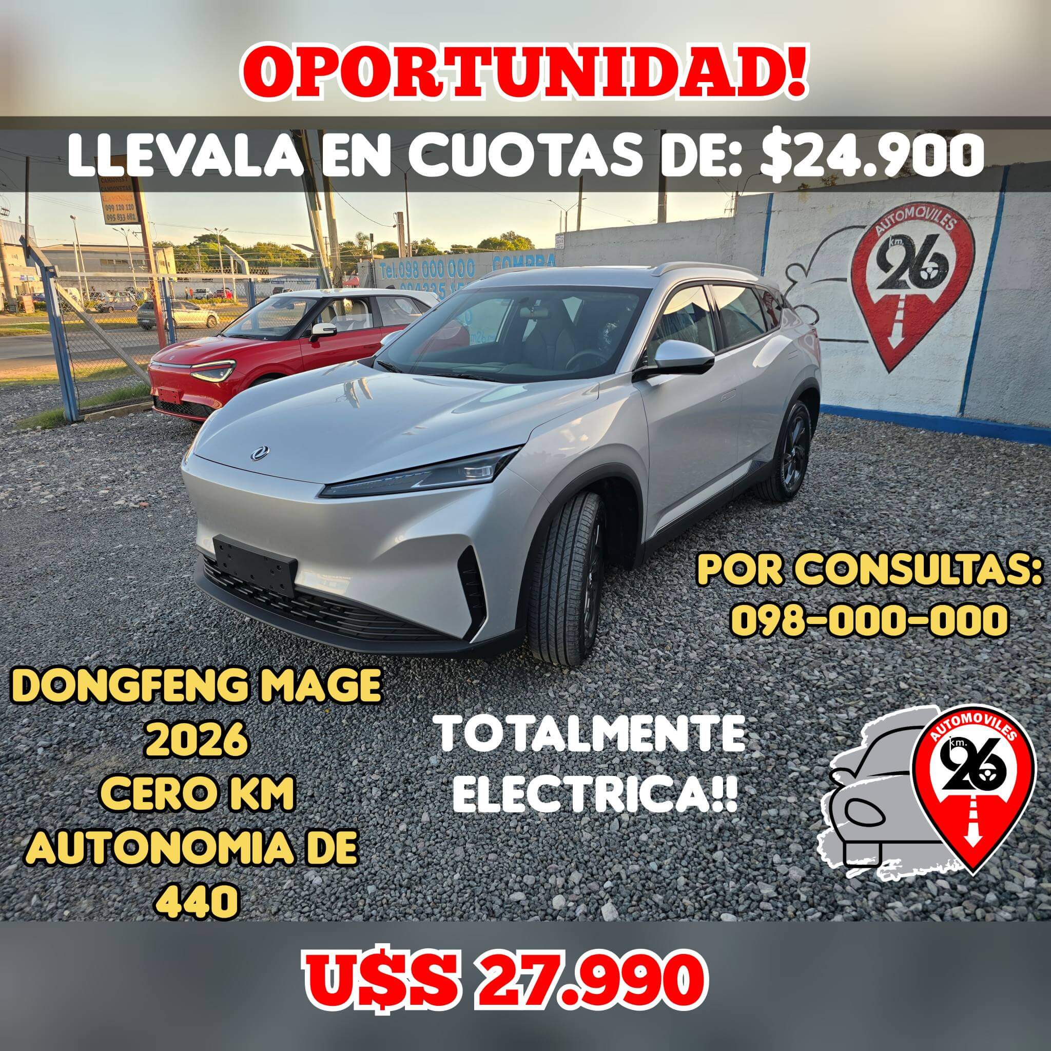 DONGFENG MAGE 2026 CERO KM U$S 27.990 OPORTUNIDAD DONGFENG MAGE, AÑO 2026, CERO KM , TOTALMENTE ELÉCTRICA LLEVALO EN CUOTAS DE $ 24900 ENTREGA INMEDIATA TOMAMOS TU VEHÍCULO COMO PARTE DE PAGO, MANDANOS FOTO E INFO AL WSP : 098-000-000 POR CONSULTAS SOBRE FINANCIACIONES DE HASTA EL 100% HASTA EN 60 CUOTAS Y EN PESOS O PERMUTAS DIRECTAMENTE AL 098-000-000 CONTAMOS CON TRÁMITES ÁGILES DE GESTORÍA ENTREGA INMEDIATA. Y POR MAS OFERTAS VISITE NUESTRA PÁGINA DE FACE Automóviles km 26 Y NUESTRA WEB : www.automovileskm26.com.uy U$S 27990 VENDEMOS VEHÍCULOSVolver a la galería de vehículos a la venta Continuar